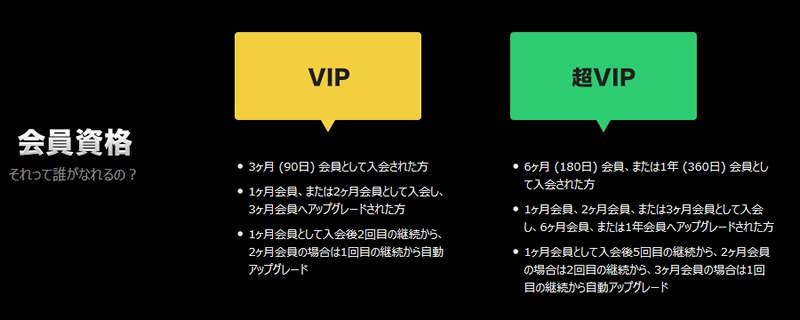 ・30日会員 or 90日会員 or 180日会員として入会し、 1年会員へアップグレードする。 ・30日会員として入会後11回目の継続、90日会員の場合は3回目の継続、 180日会員の場合は1回目の継続をすると自動的にアップグレード。 |
