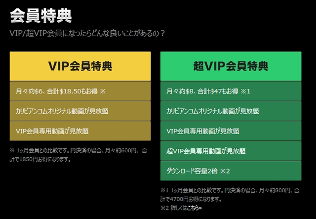 カリビアンコムには通常の会員の他にVIP会員と超VIP会員、さらに1年会員という会員ランク制度があります。上位のランクになると専用動画があったり、1日のダウンロード容量制限がアップするなどいくつかの特典受けられるようになります。